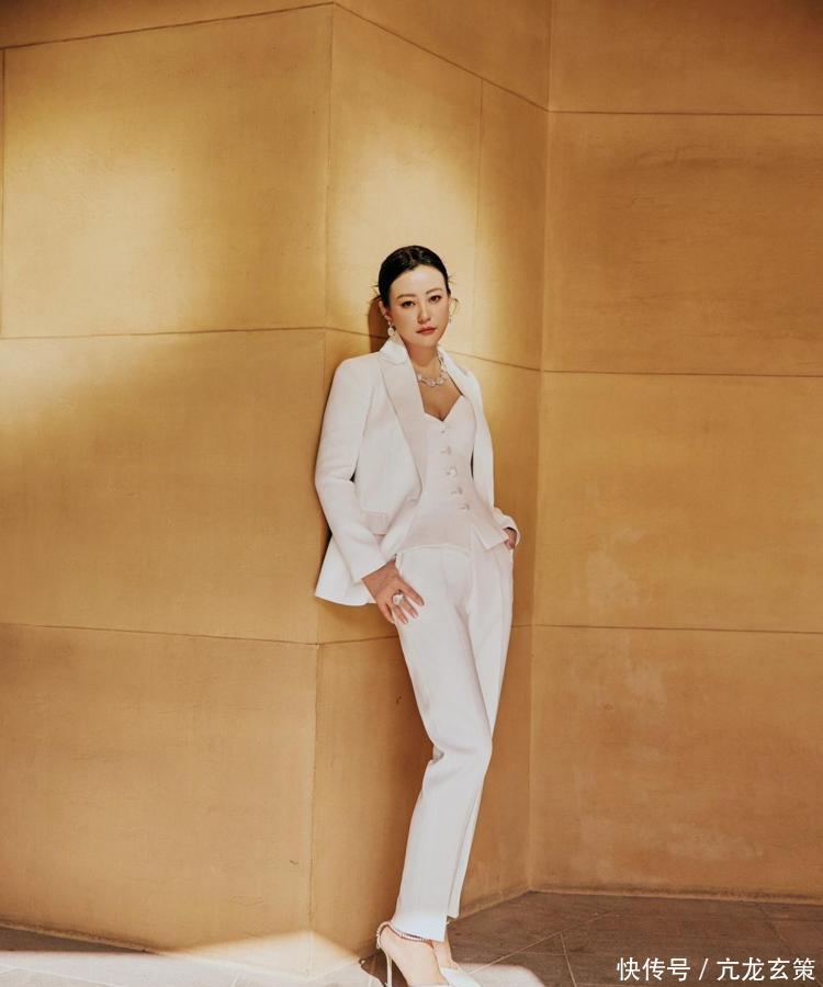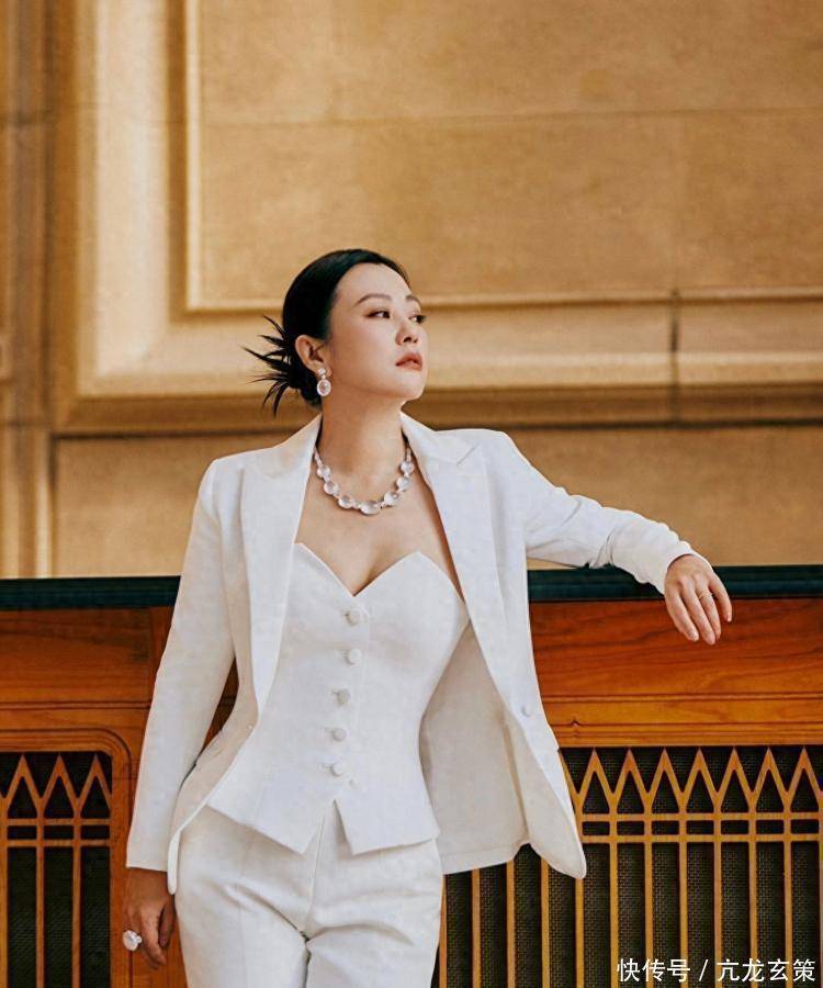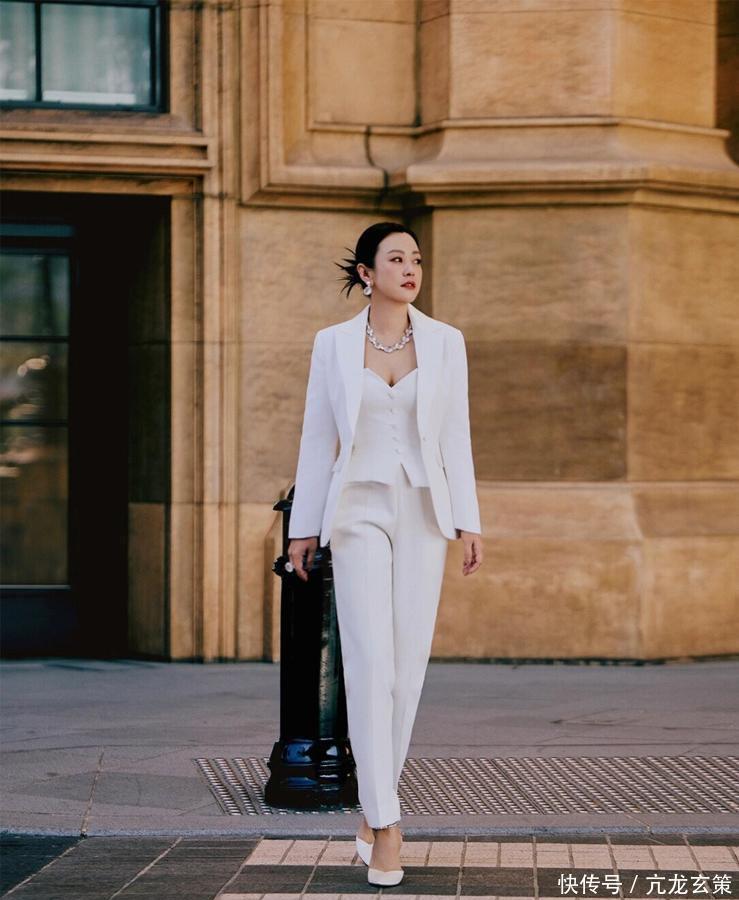郝蕾的白西装抹胸,就是典型的“刚柔碰撞”。西装是“硬”的(挺括面料、直线剪裁),抹胸是“软”的(曲线设计、性感元素)。普通人想尝试,可以选一件版型利落的西装(推荐垫肩小、长度到臀的款式),内搭选带点设计感的吊带/抹胸(比如鱼骨收腰、细肩带)。注意颜色统一(比如全白/全黑),避免花哨,配饰选简约款(细项链、小耳环),既性感又不廉价。