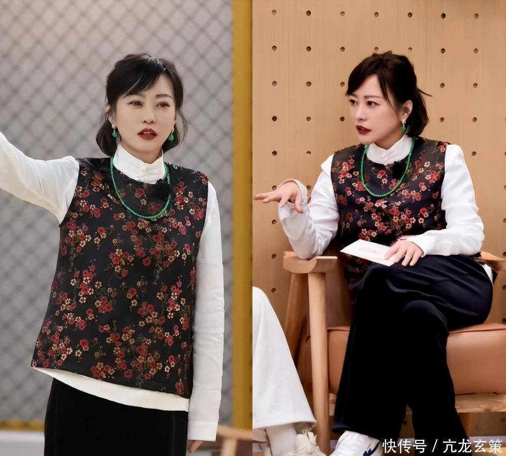 郝蕾的碎花马甲赢在“底色深、花纹小”。深色底(藏蓝、深棕、墨绿)能压得住花纹,小碎花(直径不超过2cm)更显精致。日常搭配可以学她:碎花马甲+白衬衫(立领/小翻领修饰脖子)+黑裤子(阔腿/直筒显瘦)+小白鞋(降低复古感,更日常)。怕显老的话,选浅色系碎花(浅粉底+浅黄碎花),搭配牛仔/浅色裤子,瞬间年轻5岁。